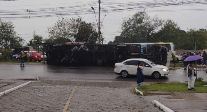 Uma carreta tombou na tarde desta quinta-feira (8) nas proximidades da Bola da Suframa, rotatória do Distrito Industrial, um dos trechos mais movimentados da zona sul de Manaus. A chuva molhou a pista e pode ter contribuído para o acidente.