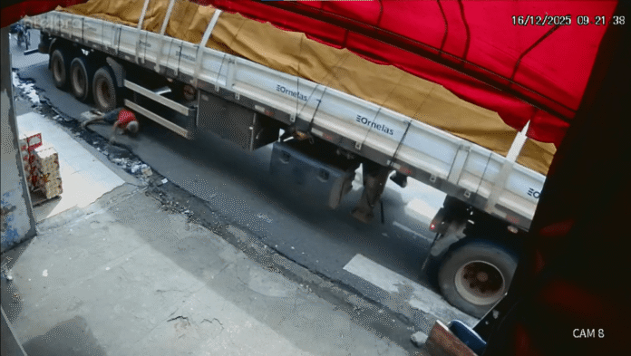 Imagens de uma câmera de segurança de um estabelecimento comercial mostram o momento em que a carreta trafega lentamente pela avenida. Ao passar ao lado do veículo, o idoso se desequilibra, cai no asfalto e tem a perna atingida pelo caminhão.
