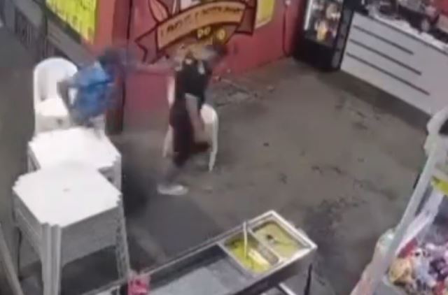 Câmeras de segurança registraram a ação de um homem armado durante um assalto a uma pizzaria na madrugada desta quinta-feira (19), no bairro Braga Mendes, zona leste de Manaus.